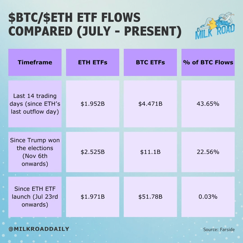 Viz tato tabulka – procento toků spotřebovaných Ethereum ETF ve srovnání s ETF se v posledním období zvýšilo.