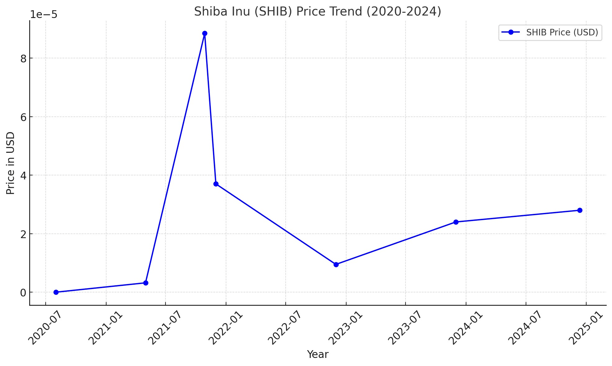 Shiba Inu byla spuštěna v srpnu 2020 jako kryptoměna inspirovaná meme, která získala rychlou pozornost během šílenství meme coinů v roce 2021. Původně obchodovaná za zanedbatelné hodnoty, její cena vzrostla v květnu 2021, podpořena spekulativním obchodováním a doporučeními od osobností jako Elon Musk. Do října 2021 dosáhl SHIB svého historického maxima přibližně 0,00008845 $, což je významný nárůst od jeho počáteční ceny.
