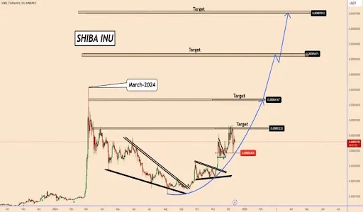 Sdílením cenového grafu analytik stanovil několik cílových úrovní při pokračování Shiba Inu v jeho rostoucí trajektorii. Strmě rostoucí křivka v grafu také naznačuje, že cena SHIB by mohla vstoupit do silného parabolického pohybu směrem vzhůru po překonání hlavních rezistenčních úrovní.