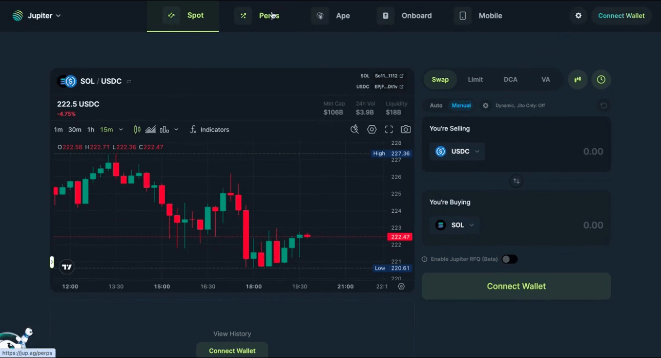 ꩜ Jupiter je pokročilý agregátor burzy poskytující likviditu pro ekosystém Solana.