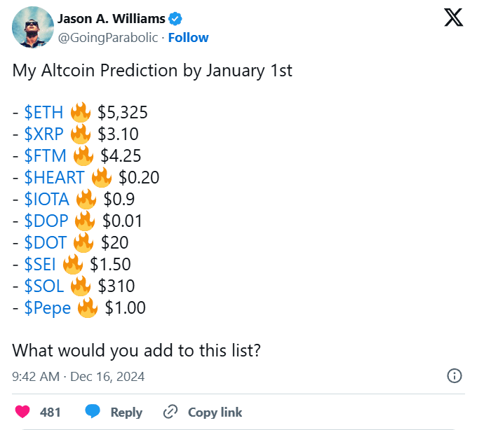 Williams, široce sledovaný tržní pozorovatel, podrobně popsal svou projekci v nedávném příspěvku na X. Také poskytl cenové cíle pro další vedoucí altcoiny.