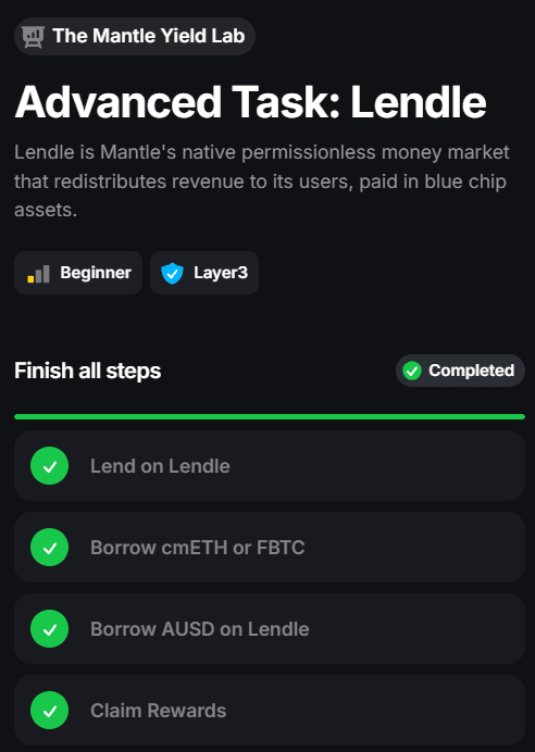 Strategie Lendle se zaměřuje především na zažít proces vkladu a půjčování, zahrnující aktiva jako FBTC, cmETH a AUSD, což jsou tři nativní aktiva na řetězci Mantle.