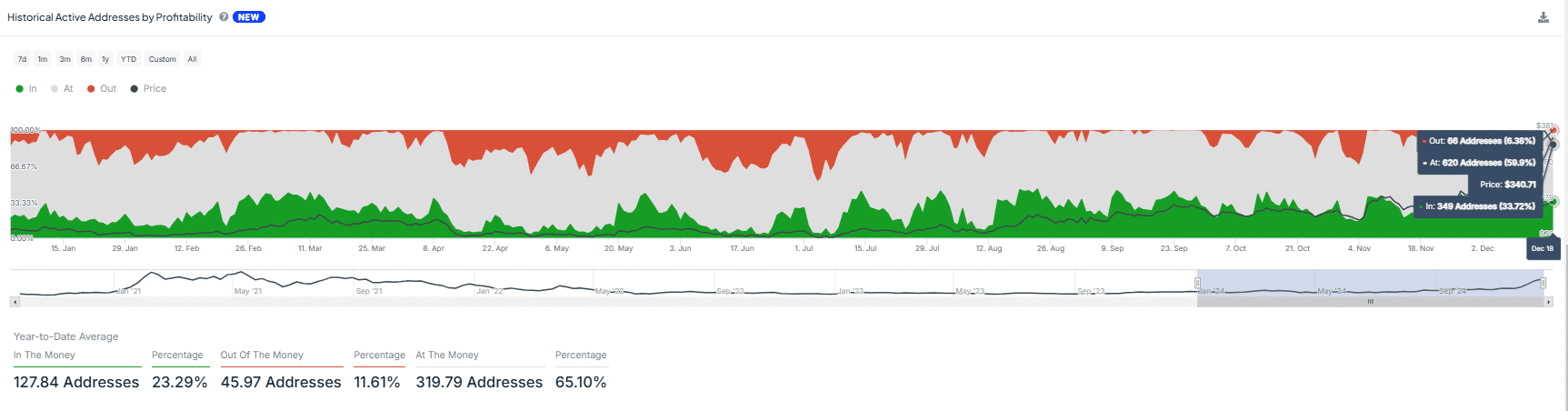 Průměrná ziskovost adres ukazuje, že 23,29 % investorů je „v zisku“, což je výrazně více než 11,61 % „mimo zisk“. Dále, 10% nárůst ziskových adres, dosahující 33,72 %, signalizuje silnou podporu kolem současné cenové úrovně 340,71 dolarů.