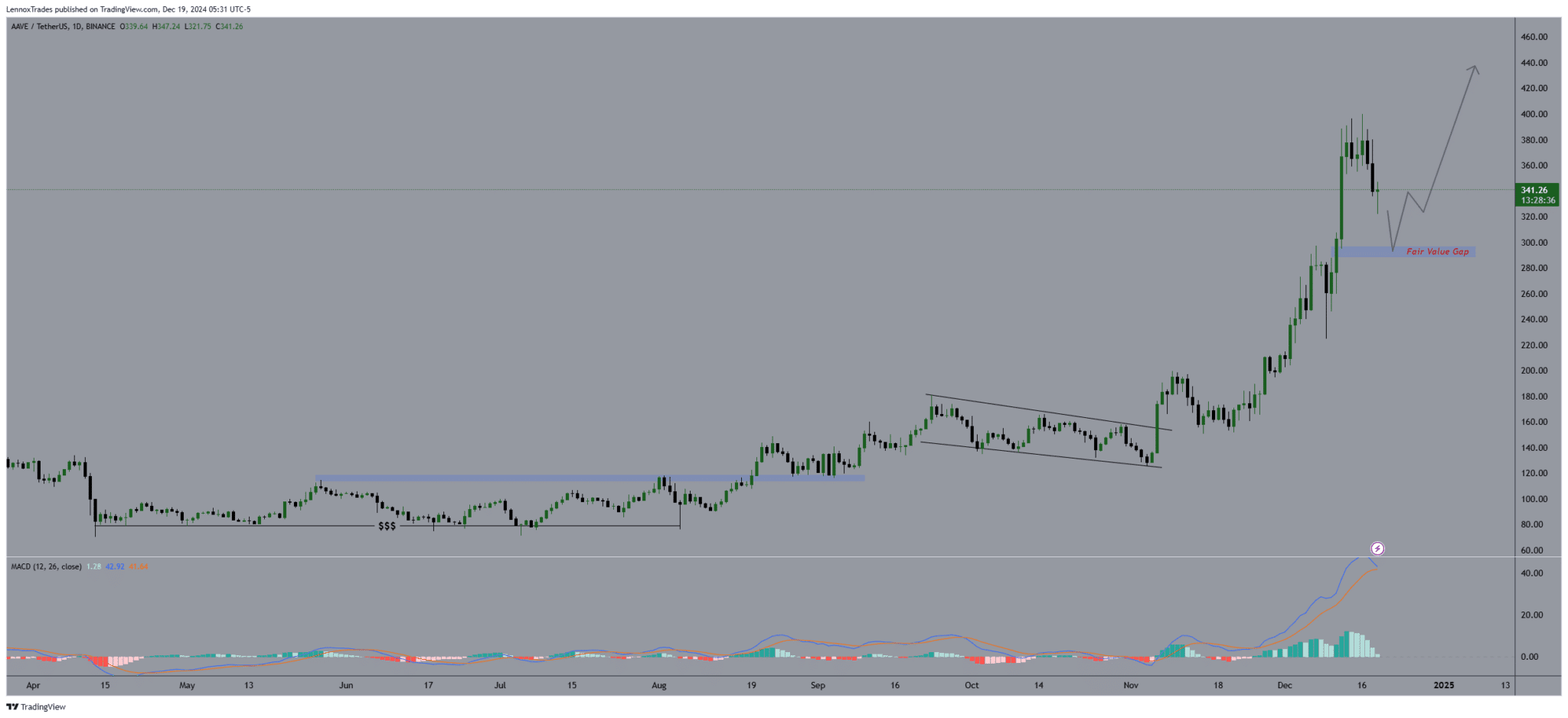 Současná cena AAVE se drží nad významnou úrovní podpory kolem 300 dolarů, známou jako Fair Value Gap (FVG). Tato úroveň je považována za klíčový bod obratu, který může podnítit další růst ceny.