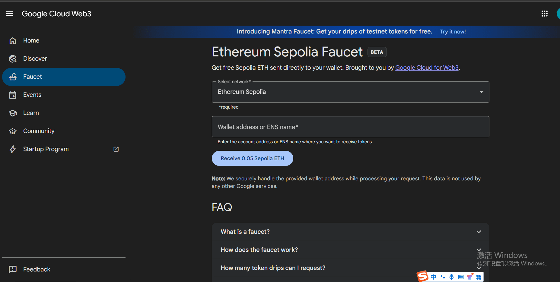 Oficiální most pro cross-chain také poskytuje faucet, zde potřebujete mít na ETH hlavním řetězci alespoň 0.01 ETH pro faucet.