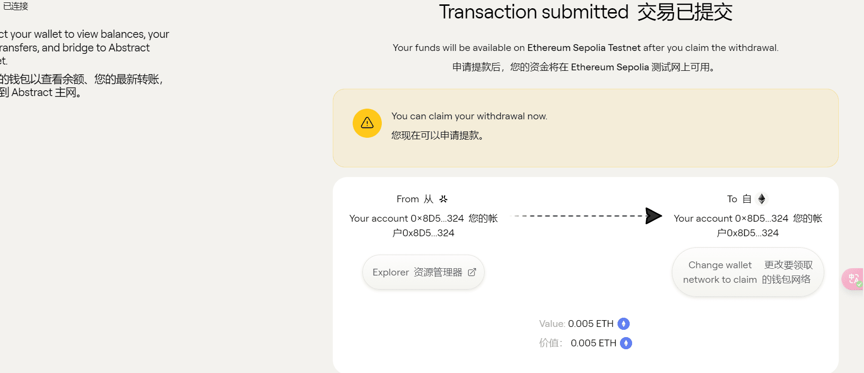 Přepněte na kartu „Bridge“ Přeneste ETH z Sepolia sítě na Abstract testnet Zadejte množství tokenů, které chcete převést Schvalte transakci
