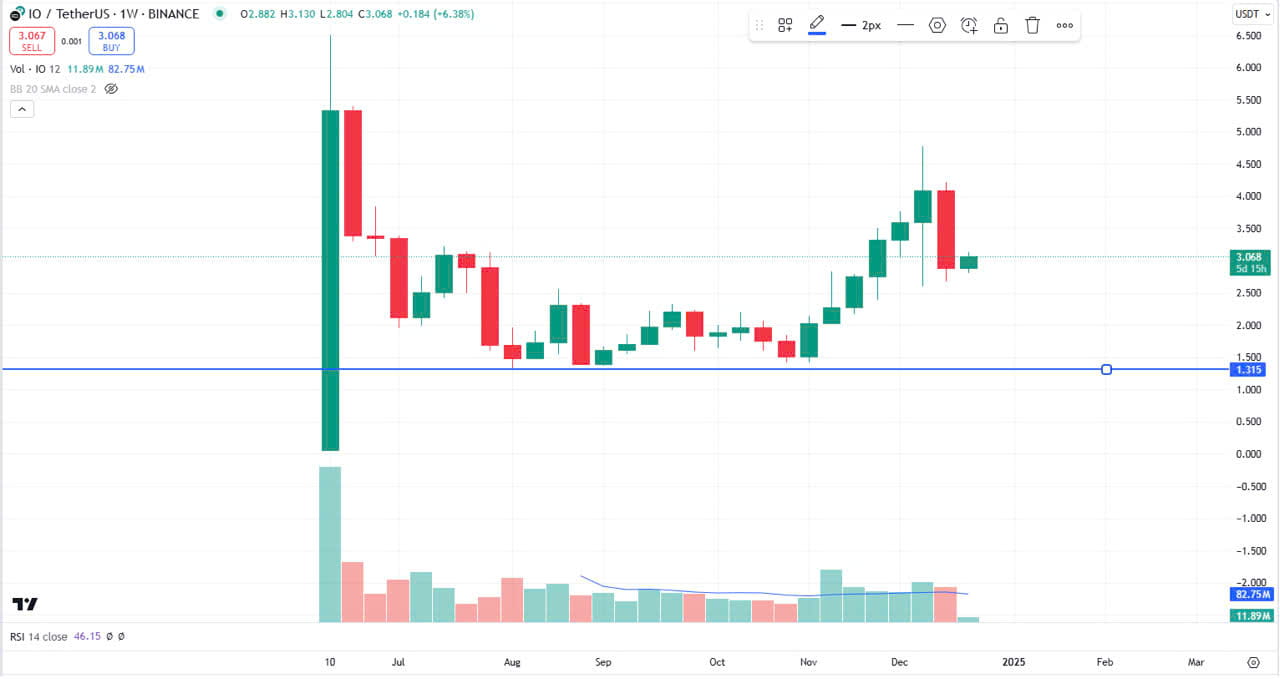 Patřící do sektoru DePIN s unikátním mechanismem poháněným GPU, IO.NET si klade za cíl stát se klíčovým hráčem v rozvoji AI aplikací. I přes nedávné nárůsty cen naznačuje jeho tržní kapitalizace pouhých 150 milionů $, že je tu dostatek prostoru pro růst, zejména s očekávaným boomem trhu AI v roce 2025. To dělá z IO.NET atraktivní volbu pro investory hledající příležitosti vysokého růstu (viz graf 👇).