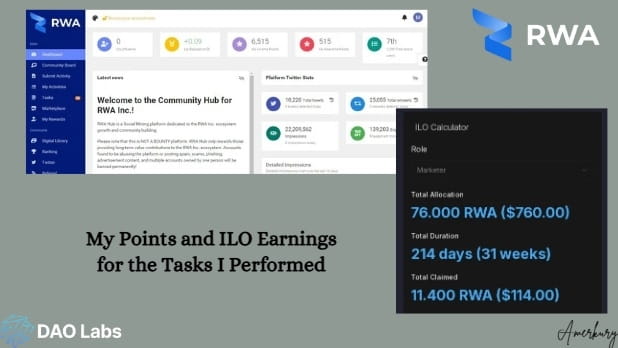 Úkoly, které přicházely do RWA Hub, jsem plnila docela nadšeně. Pak bylo oznámeno, že bude program ILO. To mi umožnilo získat body, které jsem obdržela za úkoly, které jsem vykonala, ne jako USDT, ale jako $RWA jako svůj vlastní token jako odměnu za mé úsilí. Úkol byl zveřejněn v 1. týdnu a já jsem tento úkol splnila. Také jsem retweetovala a lajkovala příspěvky platformy na Twitteru.