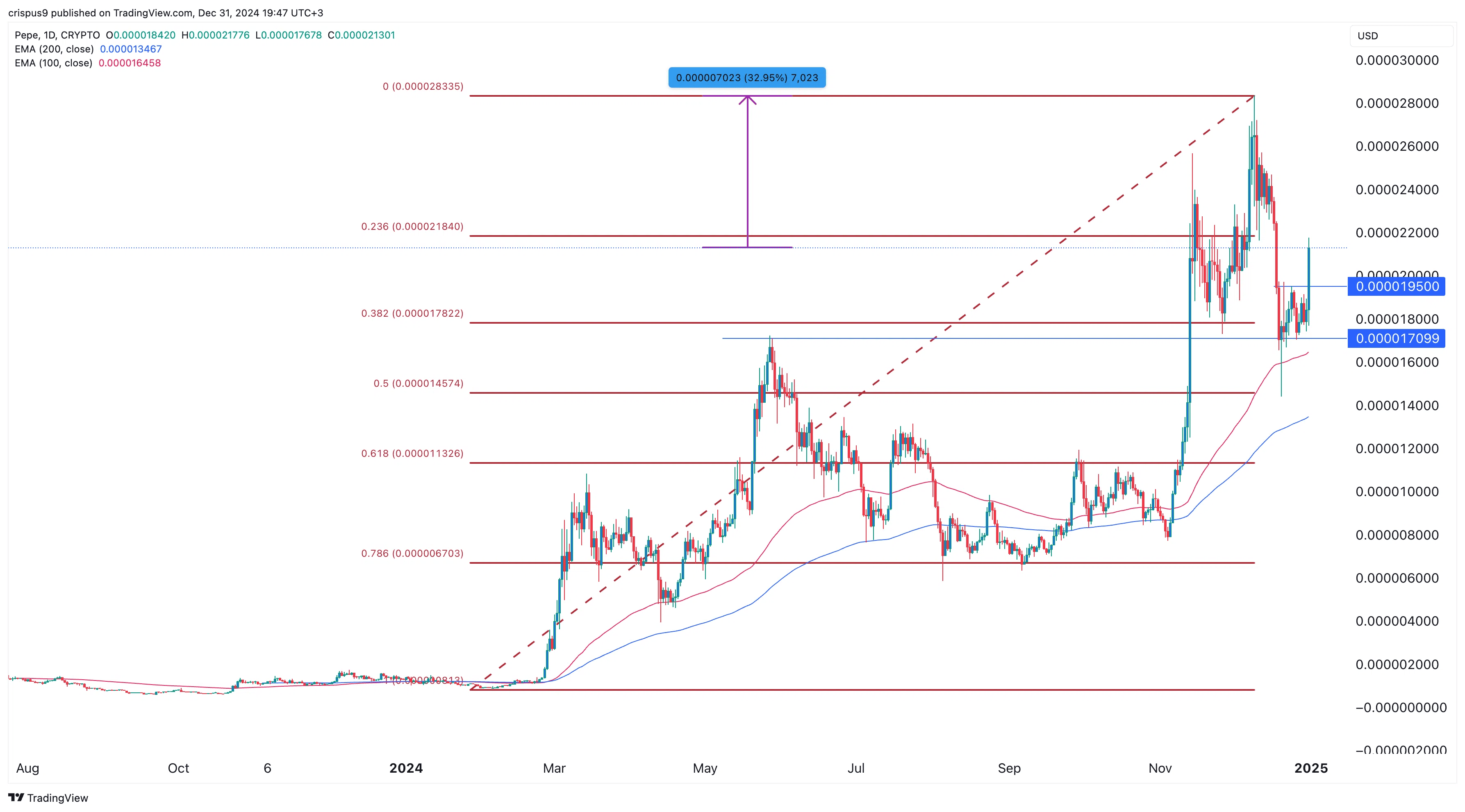 Pepe coin, třetí největší meme coin na trhu, zaznamenal výrazný nárůst ceny směřující do konce roku 2024. Jeho cena vzrostla zhruba o 20 %, čímž zvrátila některé ztráty, které utrpěl začátkem tohoto měsíce. Pepe se nyní obchoduje za 0,000022 USD, což je nejvyšší úroveň od 18. prosince.
