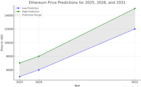 S výhledem do roku 2025 se očekává, že Ethereum si udrží svou vedoucí pozici v sektorech DeFi a chytrých kontraktů. Jak Ethereum pokračuje ve vývoji s přechodem na Ethereum 2.0, který se zaměřuje na škálovatelnost, bezpečnost a energetickou efektivitu, experti předpovídají, že ETH by se mohl pohybovat mezi 5 907,41 USD a 7 194,28 USD do konce roku, s průměrnou cenou kolem 6 124,39 USD.