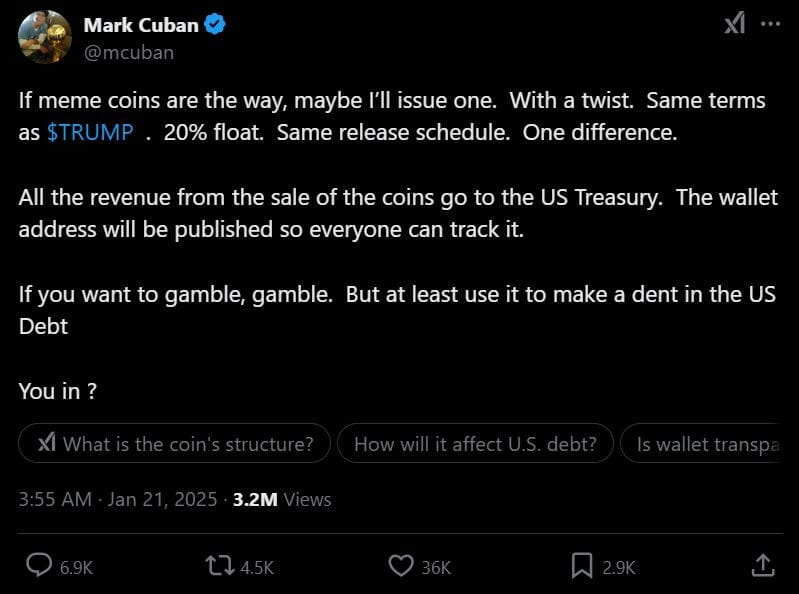 Cuban načrtl svůj plán na X a řekl, že meme mince bude fungovat podobně jako token $TRUMP, přičemž pouze 20 % z nich bude obchodovatelných a harmonogram vydání bude naprosto stejný jako u mince $TRUMP, příjmy z prodeje této mince budou použity na splácení státního dluhu USA.