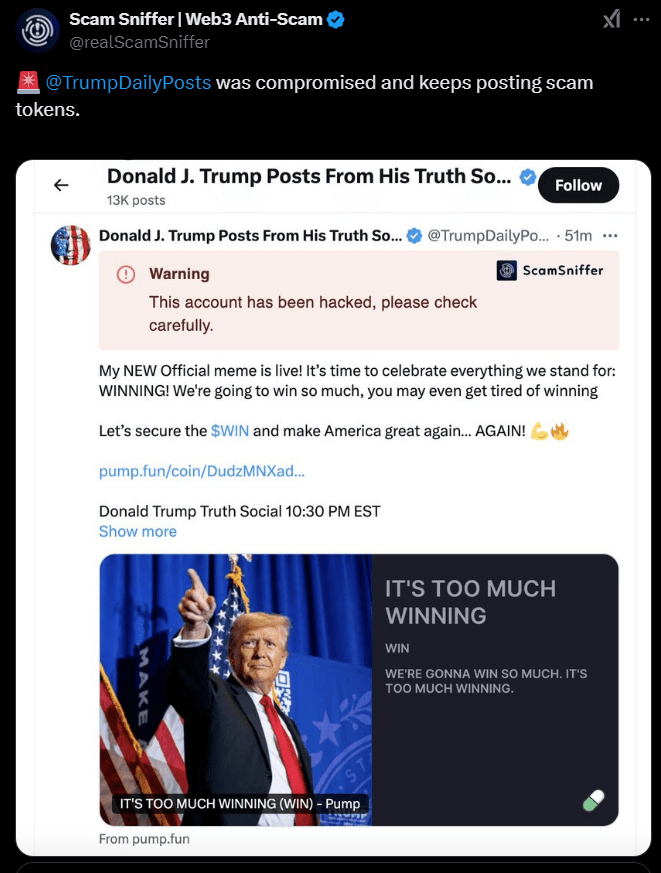 Účet @TrumpDailyPosts na platformě X (dříve Twitter) byl hacknut a zneužíván k šíření falešných adres meme coinů. Zkompromitovaný účet nadále aktivně propaguje několik podvodných tokenů, včetně falešného tokenu s názvem $POWER.