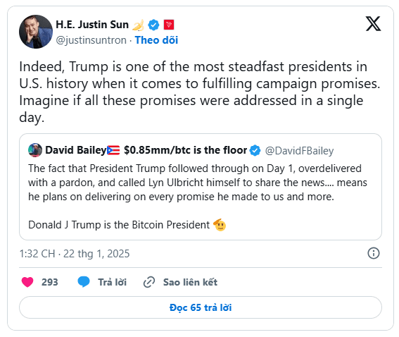 Justin Sun chválí Trumpa za jeho neochvějný závazek plnit své sliby, často překračující očekávání. Jedním z nejvýraznějších příkladů je, že Trump údajně udělil milost Rossu Ulbrichtovi, zakladateli trhu Silk Road. Není to jen milost, Trump také osobně informoval Ulbrichta o svém rozhodnutí, zdůrazňující svou oddanost plnění závazků, které učinil vůči kryptoměnové komunitě. Tento krok symbolizuje Trumpovu ochotu podnikat odvážné kroky, které jsou hluboce podporovány zastánci decentralizovaných technologií.