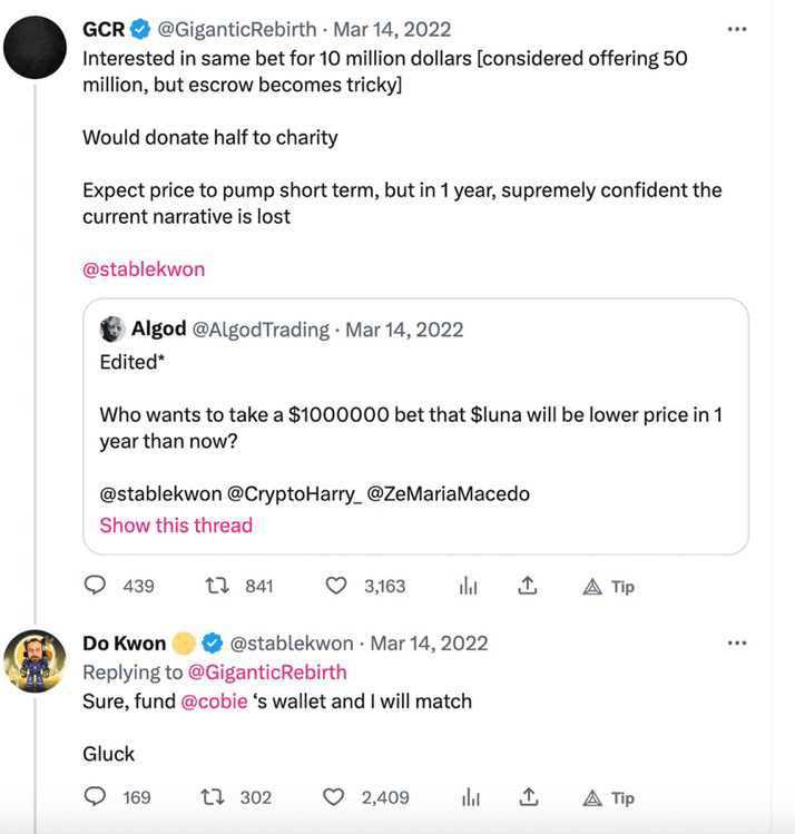 V březnu 2022 vyzval GCR zakladatele $LUNA Do Kwon k sázce v hodnotě 10 milionů dolarů.