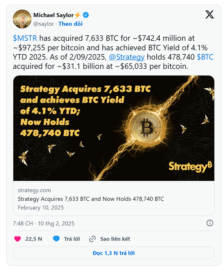 Podle informací od výkonného předsedy Michaela Saylora byl tento nákup proveden za průměrnou cenu 97 255 dolarů za bitcoin, čímž se celková průměrná nákupní cena společnosti zvýšila na 65 033 dolarů.