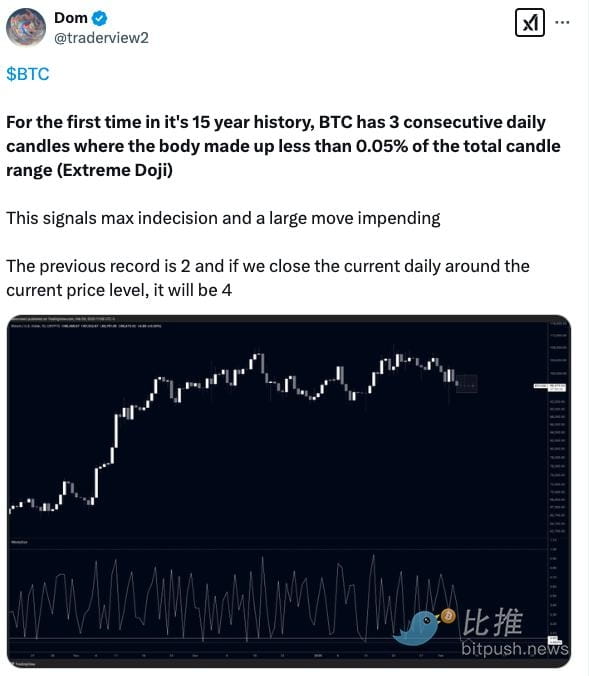 DOM uvedl: „V 15leté historii Bitcoinu se poprvé objevily tři po sobě jdoucí ‚extrémní doji‘ svíce, přičemž skutečná část každé svíce zabírá méně než 0,05 % celého rozsahu svíce. To naznačuje, že trh je extrémně nerozhodný, což předpovídá blížící se výrazné výkyvy.“