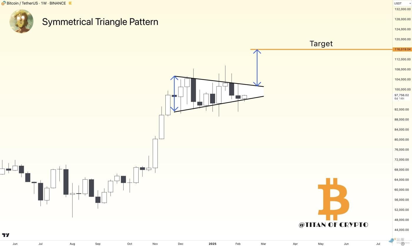 Tržní analytik Titan of Crypto poznamenal, že cena Bitcoinu má potenciál překonat horní trendovou linii trojúhelníku a nakonec dosáhnout cílové hodnoty 116 000 dolarů. Podle pravidel technické analýzy se způsob výpočtu cílové hodnoty pro růst skládá z maximální vzdálenosti mezi horní a dolní trendovou linií trojúhelníku přičtené k potenciálnímu průlomovému bodu. Tento přístup poskytuje teoretický základ pro cílovou hodnotu vzestupu Bitcoinu.