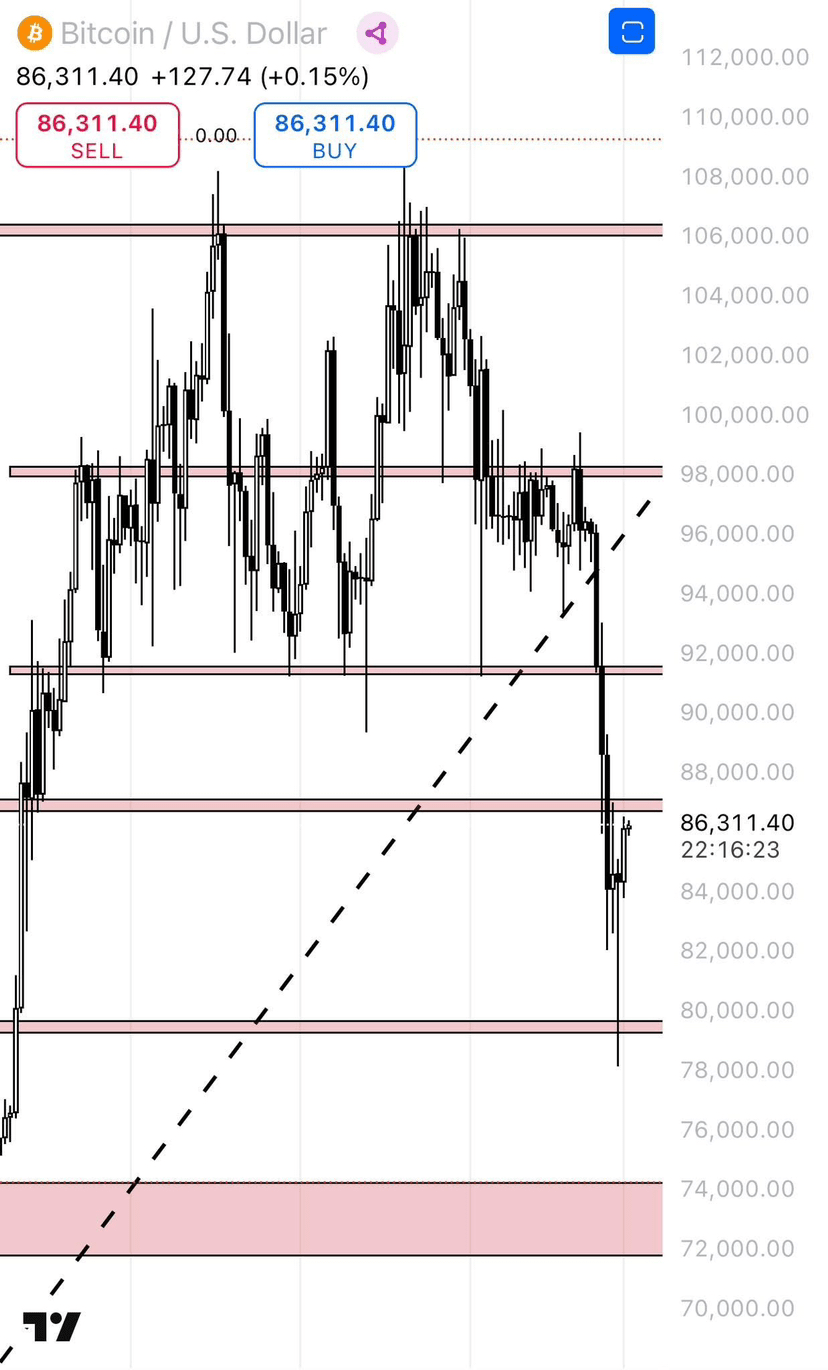 BTC nyní změnil tržní strukturu a jsme nyní v klesajícím trendu, takže pokud neprolomíme odpor 87k, spadneme na podporu kolem 73K.