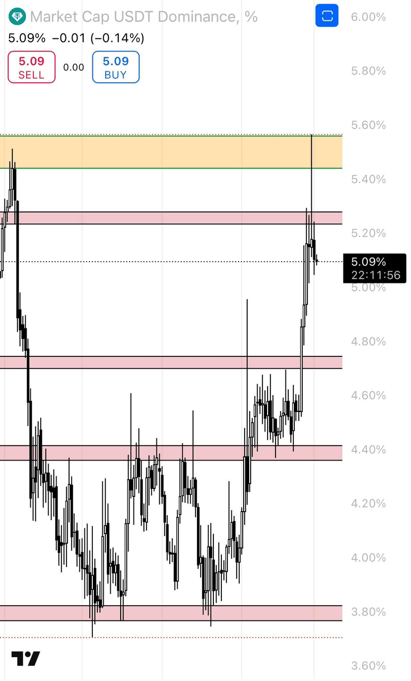 Graf 2: Dominance USDT uzavřela jako medvědí svíčka a znovu odmítla odpor 5,25%.