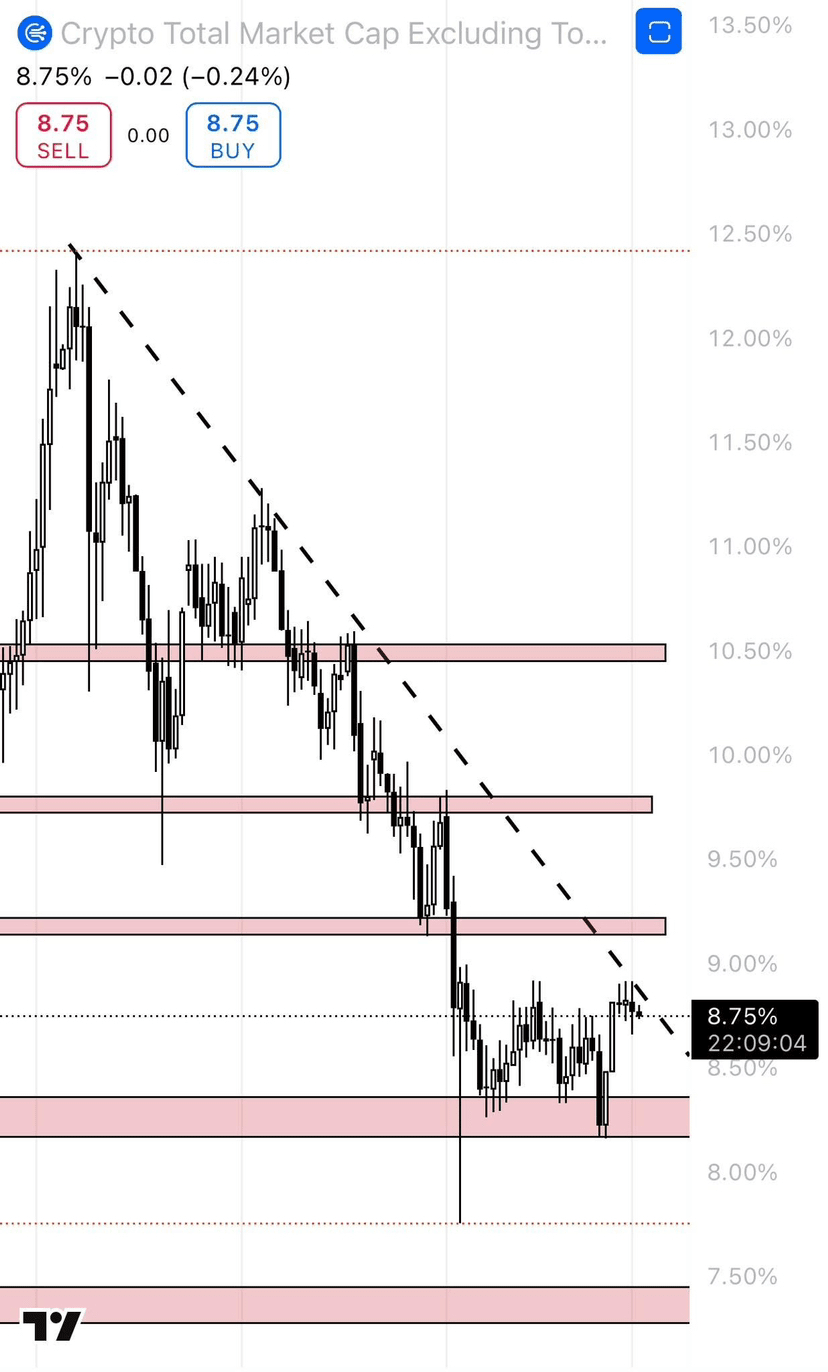 Osobně nevěřím, že toto je konec býčího trhu a že dojde k alt sezóně, jakmile BTC.D prolomí svůj rostoucí trend a začne klesat, jako to teď začíná.