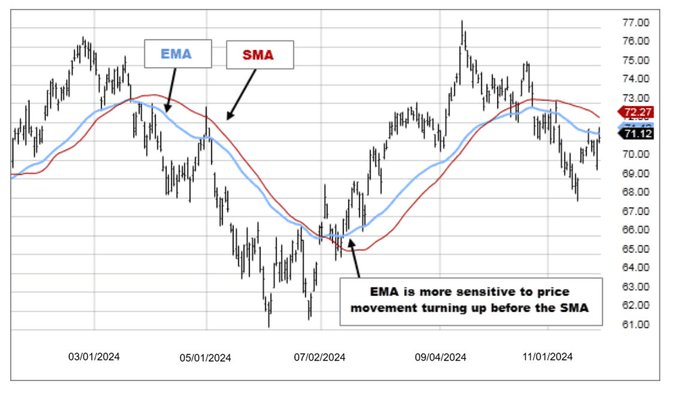 ✅ EMA (Exponenciální klouzavý průměr) → Klade větší důraz na nedávné ceny, rychleji reaguje na trendy