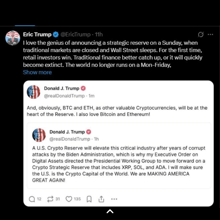 Takže, pokud jste ještě neslyšeli, *Trump* učinil překvapivé oznámení o *Federálním rezervním systému*, zmínil *ADA*, *XRP* a *SOL*. Na první pohled se to zdá jako skvělá věc pro kryptoměnový trh 🌍 – ceny vzrostly, Bitcoin začal růst a trh vzrostl na více než *3 biliony dolarů* 🚀. Ale dovolte mi říct, *tento náhlý skok* se zdá podezřelý! 🐟