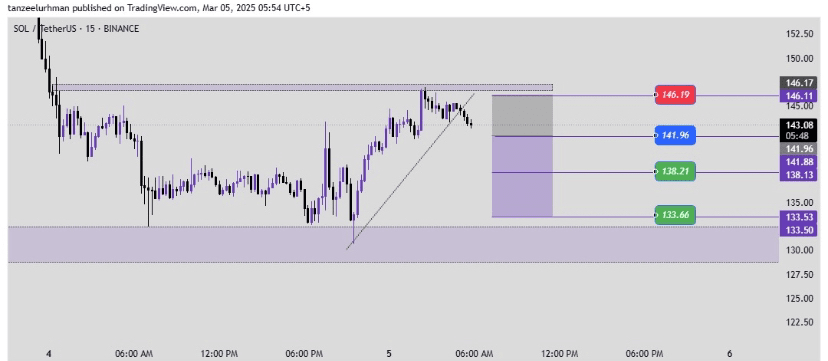 $SOL nedávno porušila dolní linii podpory, přibližuje se k zóně odporu, a nyní může pozorovat další silný prodej, zejména po opětovném testování. To signalizuje trhu, že pokles je pravděpodobnější, a investoři by měli být opatrní. Po potvrzení opětovného testování mohou prodejci zvýšit své pozice, což povede k poklesu cen.