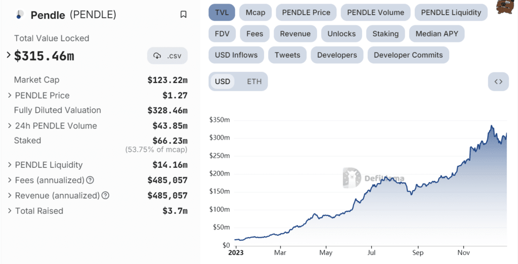 Rok 2023 byl pro Pendle dobrým vývojovým rokem, přičemž TVL se od začátku roku 2023 soustavně zvyšuje. Kromě toho Pendle přináší několik potenciálních příběhů na jedné platformě, jmenovitě aktiva reálného světa (RWA) a likvidní sázkové tokeny (LST) prostřednictvím produktů na její platforma.