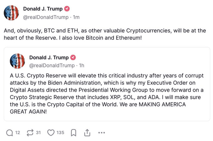 2. února: Trump oznámil zprávy o amerických kryptoměnových rezervách a zapojených mincích.