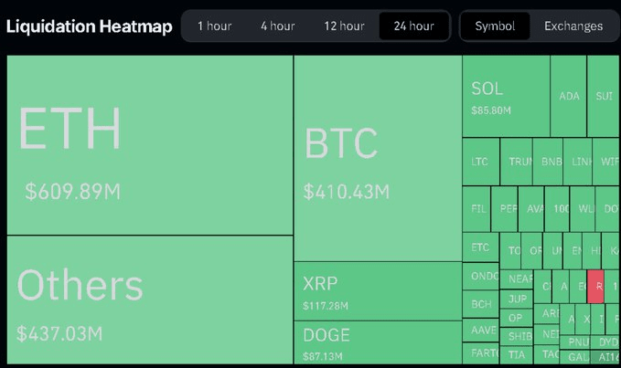 A během jediného dne tržní kapitalizace kryptoměn klesá o 4 %, což vede k vymazání více než 1,5 miliardy dolarů v likvidacích.