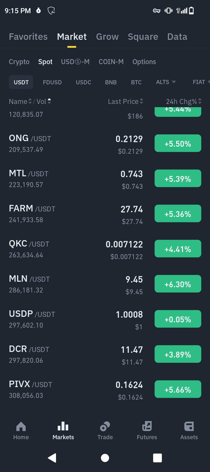 Nyní pokračujme poté, co jsme znali výše uvedené podmínky. Z vašeho řídicího panelu trhu Binance, který zobrazuje seznam aktivně obchodovaných párů, klepněte na sekci "vol" pro přepínání seřazení objemu aktuálně obchodovaných párů vzestupně nebo sestupně. Také můžete snadno rolovat nahoru nebo dolů, abyste zkontrolovali aktivně obchodované páry s nízkým objemem.