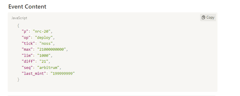 V protokolu Noscription jsou všechny operace včetně nasazení, přetypování a přenosu události jedna po druhé. Podobně jako u Brc20 jsou všechny operace zaznamenány v následujícím formátu json.