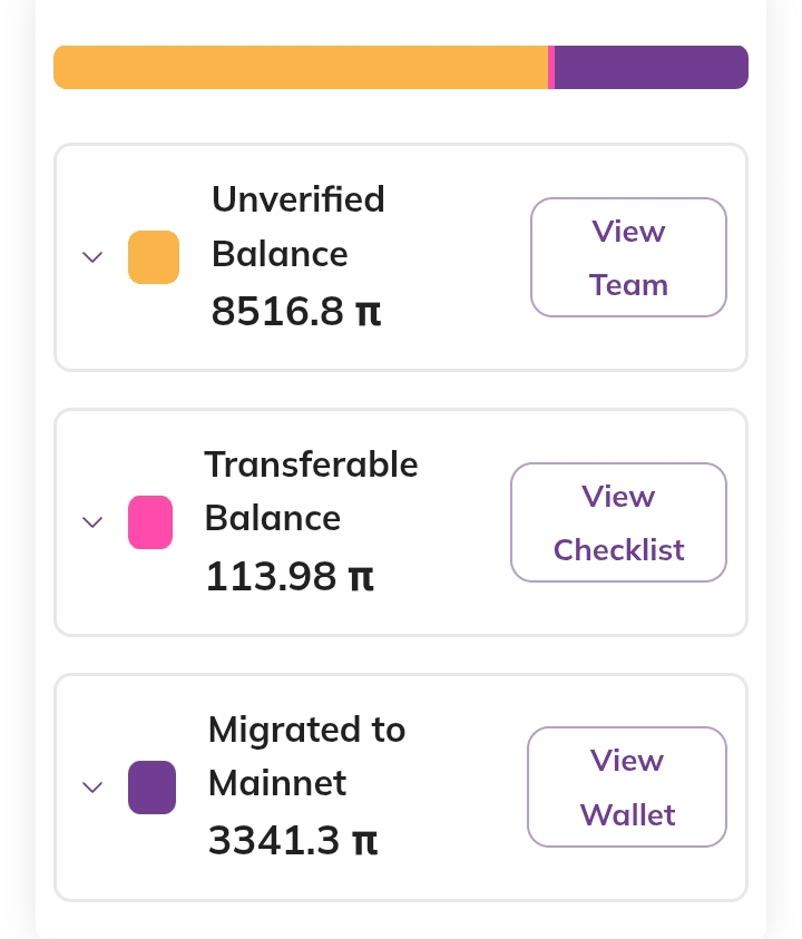 * Převoditelný zůstatek (113.98 π): To je Pi, které prošlo ověřením a je způsobilé k převodu na peněženku hlavní sítě. Relativně nízká částka naznačuje, že uživatel je stále v procesu ověřování svého týmu a sítě.