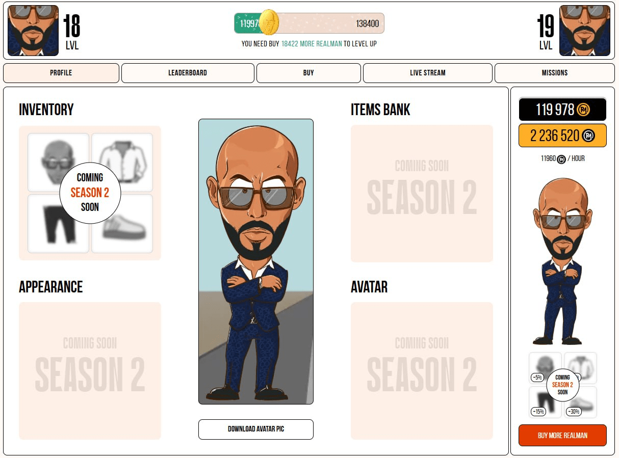 Moje cesta v #REALMAN pokračuje, a jsem již blízko k topu účastníků. Teď zvyšuju úroveň, sbírám REALMONEY a připravuji se na novou sezónu, která slibuje ještě více příležitostí pro účastníky krypto-předprodeje.