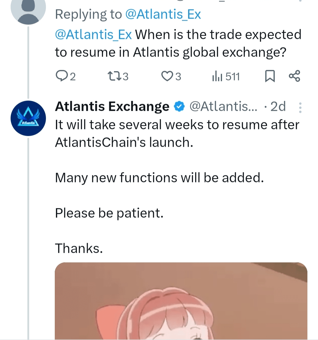 Akumulace stížností uživatelů, pochybných obchodních praktik, nedostatek regulačního dohledu a nedávné provozní kontroverze vykreslují znepokojující obraz Atlantis Exchange. Potenciálním investorům a současným uživatelům se důrazně doporučuje, aby byli velmi opatrní a provedli důkladné prověření před zapojením se na platformě, aby snížili riziko finančních ztrát.
