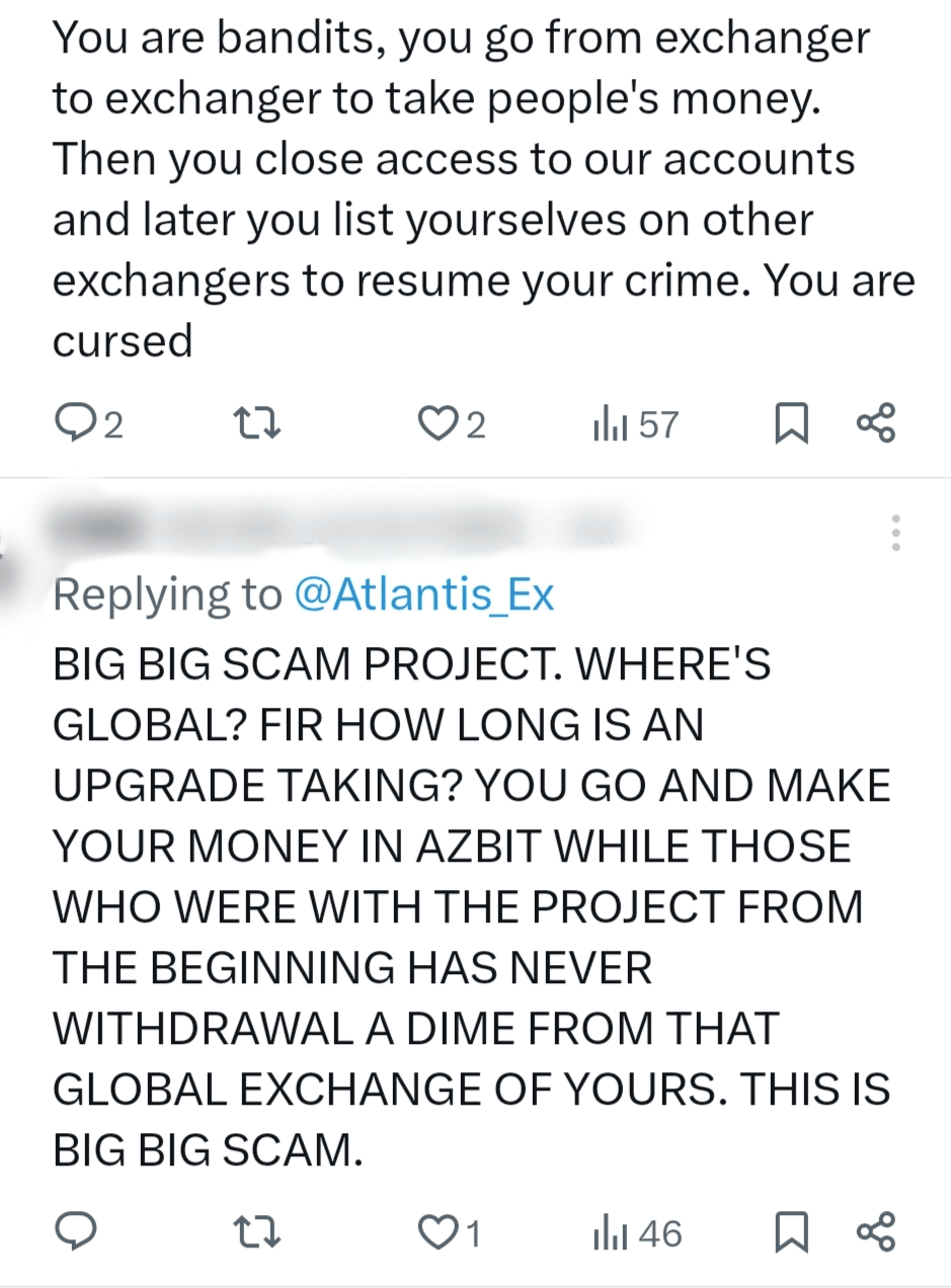 V posledních letech se Atlantis Exchange dostala pod intenzivní dohled kvůli obviněním z podvodných aktivit, což vyvolalo vážné obavy v kryptoměnové komunitě. Více uživatelů hlásilo problémy, jako jsou nedostupné prostředky, nereagující zákaznická podpora a pochybná provozní praktika, což vedlo k široké spekulaci o legitimitě platformy.