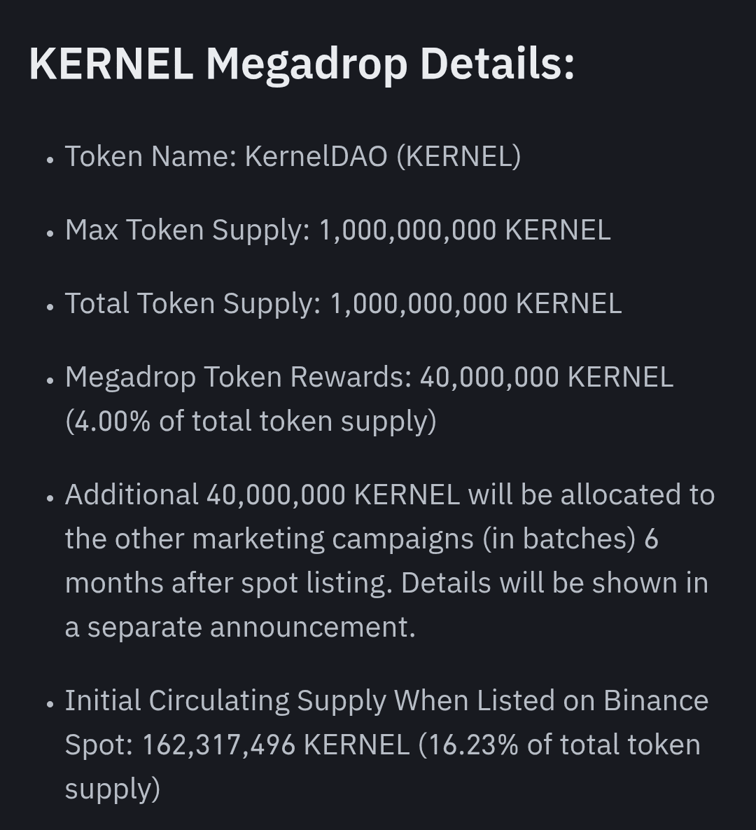 Nicméně pouze 17% počáteční nabídky může být překážkou pro hladký průběh, ale je možné to zvládnout. Binance také oznámila kampaň Megadrop s Kernel DAO, kde můžete získat zdarma token $KERNEL za splnění snadných úkolů v aplikaci Binance.