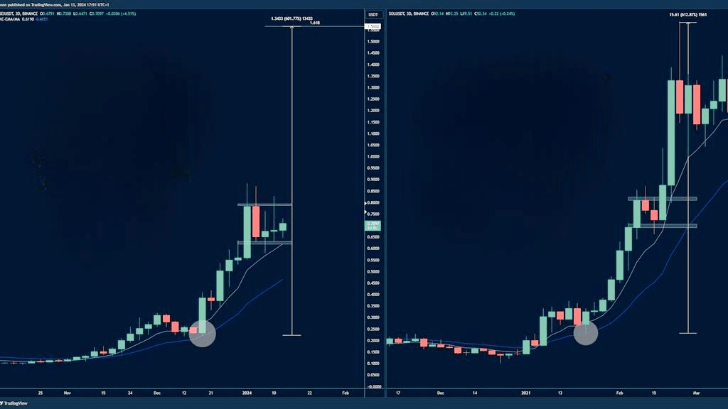 Zajímavé je, že graf SEI ukazuje rané podobnosti s historickým vzorem růstu Solany ($SOL ) - od $0.10 do $1 před velkým průlomem. Nicméně na rozdíl od Solany v roce 2021, SEI v současnosti postrádá momentum a stabilitu objemu, aby tento růst napodobil.