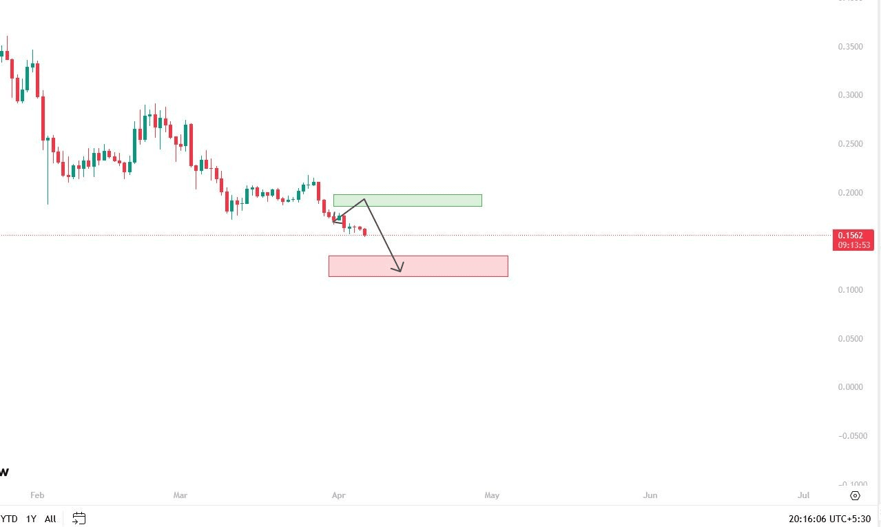 Odmítnutí trhu poblíž zóny $0.20 nyní potvrdilo tuto úroveň jako silný strop. Slabý objem nákupů zdůrazňuje opatrnost investorů, což dále podporuje současný klesající trend.