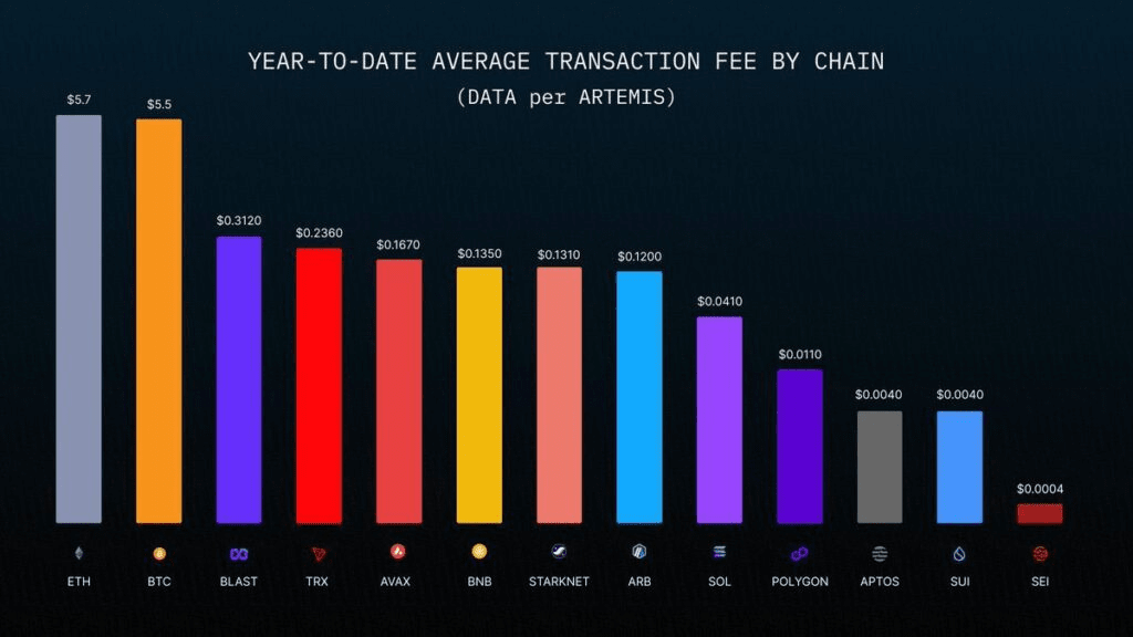 Jedním z výjimečných ukazatelů jsou ultranízké transakční poplatky SEI, které zůstávají pouze na $0.004 - zlomek nákladů na jiných populárních řetězcích: