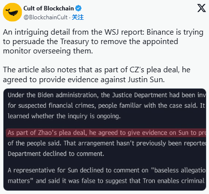 Pozornost v kryptoměnách se opět soustředí na zakladatele Binance Zhao Changpeng, podle nové zprávy Wall Street Journal (WSJ) souhlasil s poskytnutím důkazů proti zakladateli Tronu Sun Yuchenovi, což je součástí jeho dohody o přiznání viny s americkým ministerstvem spravedlnosti (DOJ). I když Zhao Changpeng dosud k tomuto obvinění přímo nekomentoval, ostře kritizoval (Wall Street Journal) za to, že zveřejnil jeho údajný další "nepodložený" útok.