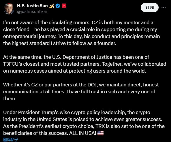 Nicméně, Sun Yuchen na to reagoval tím, že tyto obvinění jsou "bez základů" a veřejně hájil Zhao Changpenga, říkaje, že je jeho mentorem i blízkým přítelem. Zdůraznil, že Tron má s americkým ministerstvem spravedlnosti čestnou a přímou komunikaci a chválil prezidenta Trumpa za jeho vedení v oblasti kryptoměn, vyjádřil důvěru v americký trh.