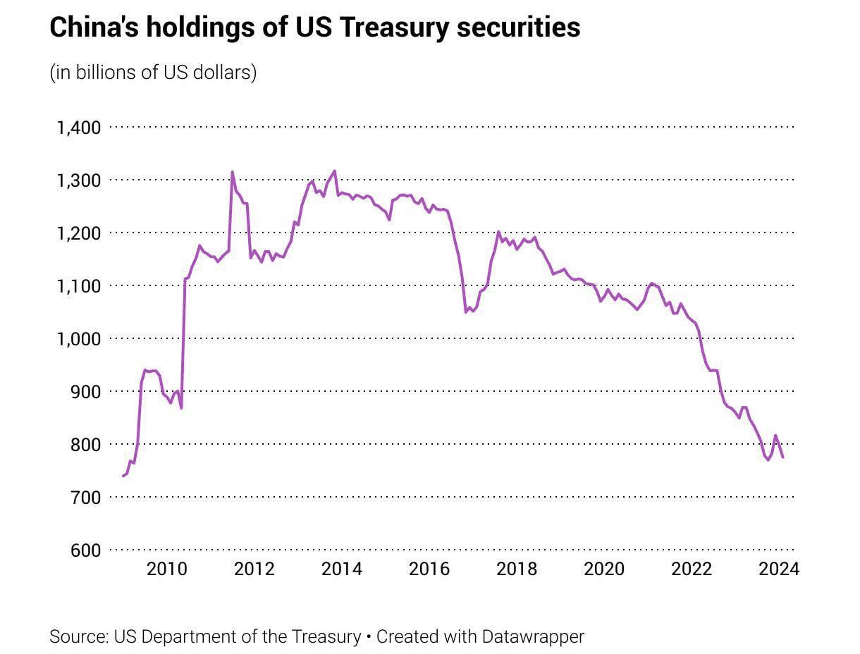Jen v únoru prodala Čína dluhopisy amerického ministerstva financí v hodnotě 22,7 miliardy dolarů, čímž snížila své celkové držení na nejnižší úroveň od roku 2009. Ano — rychle zbavují amerického dluhu.
