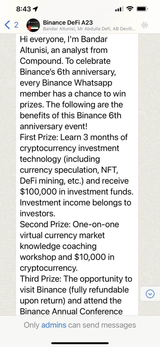 Sliby vysokých garantovaných výnosů: "Zdvojnásobte svou investici za 24 hodin" nebo "Investujte to na Binance ... (Jmenují falešné kampaně)... a získejte bez rizika."