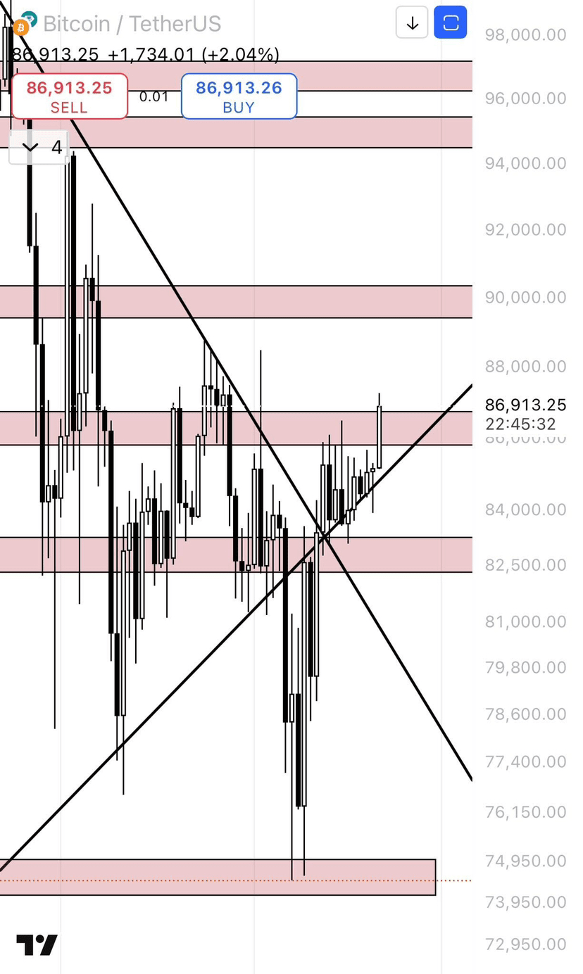 Uzavřeno jako býčí kladivo, uzavřeli jsme nad klesající trendovou linií po dobu 10 dní v řadě a v současnosti jsme prolomili odpor 86,4k.