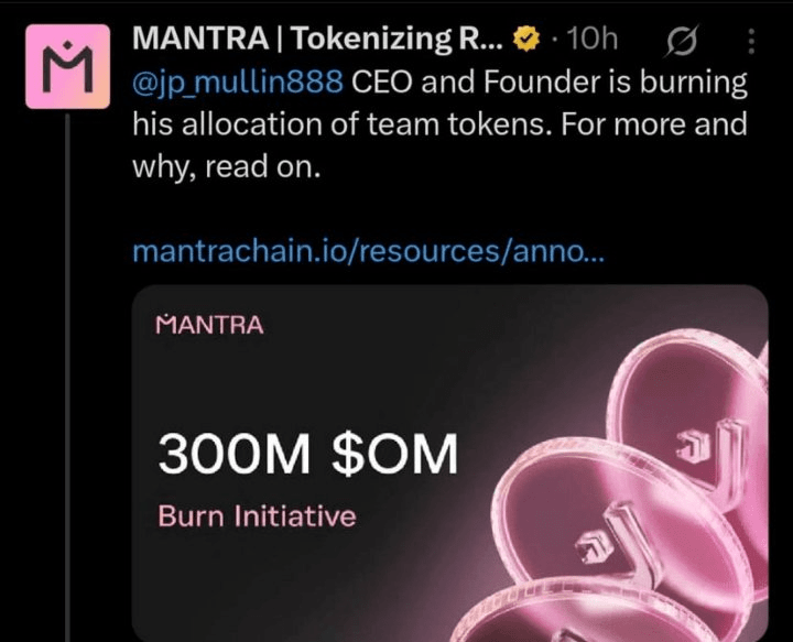 John Patrick Mullin, generální ředitel a spoluzakladatel MANTRA, vede iniciativu tím, že obětuje svou celou osobní alokaci—150 milionů tokenů, které mají hodnotu přes 82 milionů dolarů. Dalších 150 milionů tokenů bude přidáno partnery ekosystému MANTRA, které budou trvale odstraněny z oběhu do 29. dubna 2025.