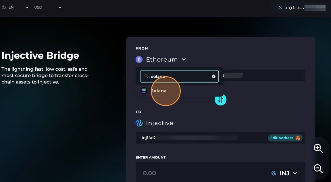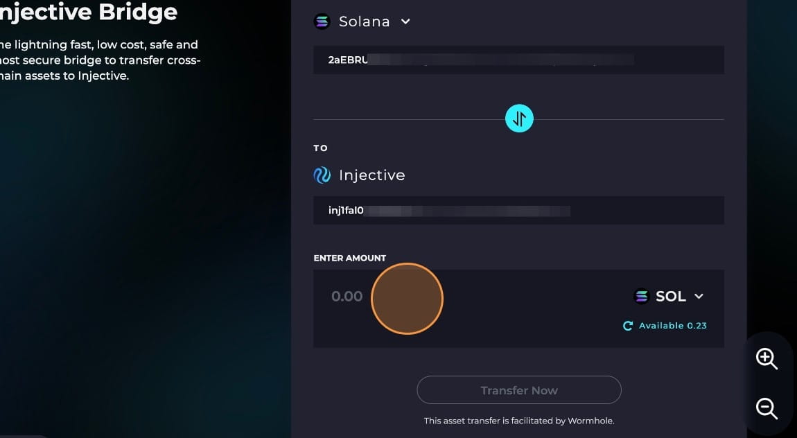 Zadejte množství SOL, které chcete přemostit ze Solana na Injective