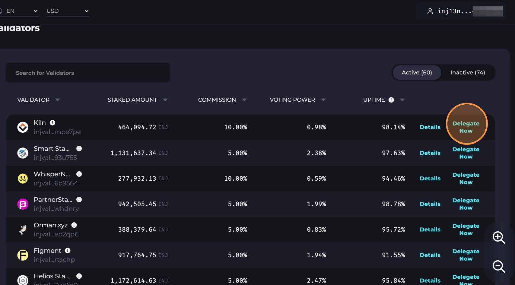 Vyberte si některý z dostupných validátorů a klikněte na „Delegovat nyní“