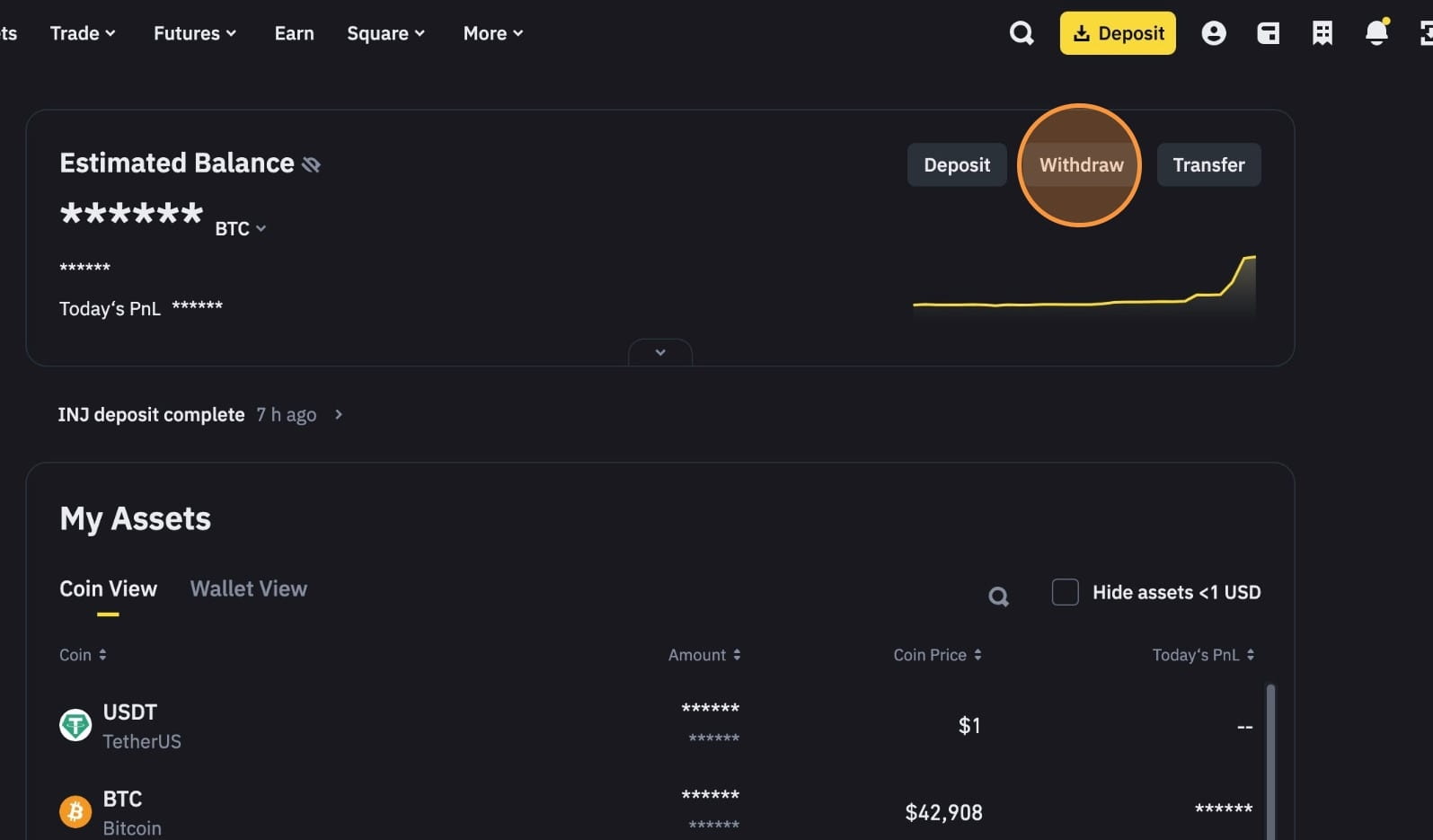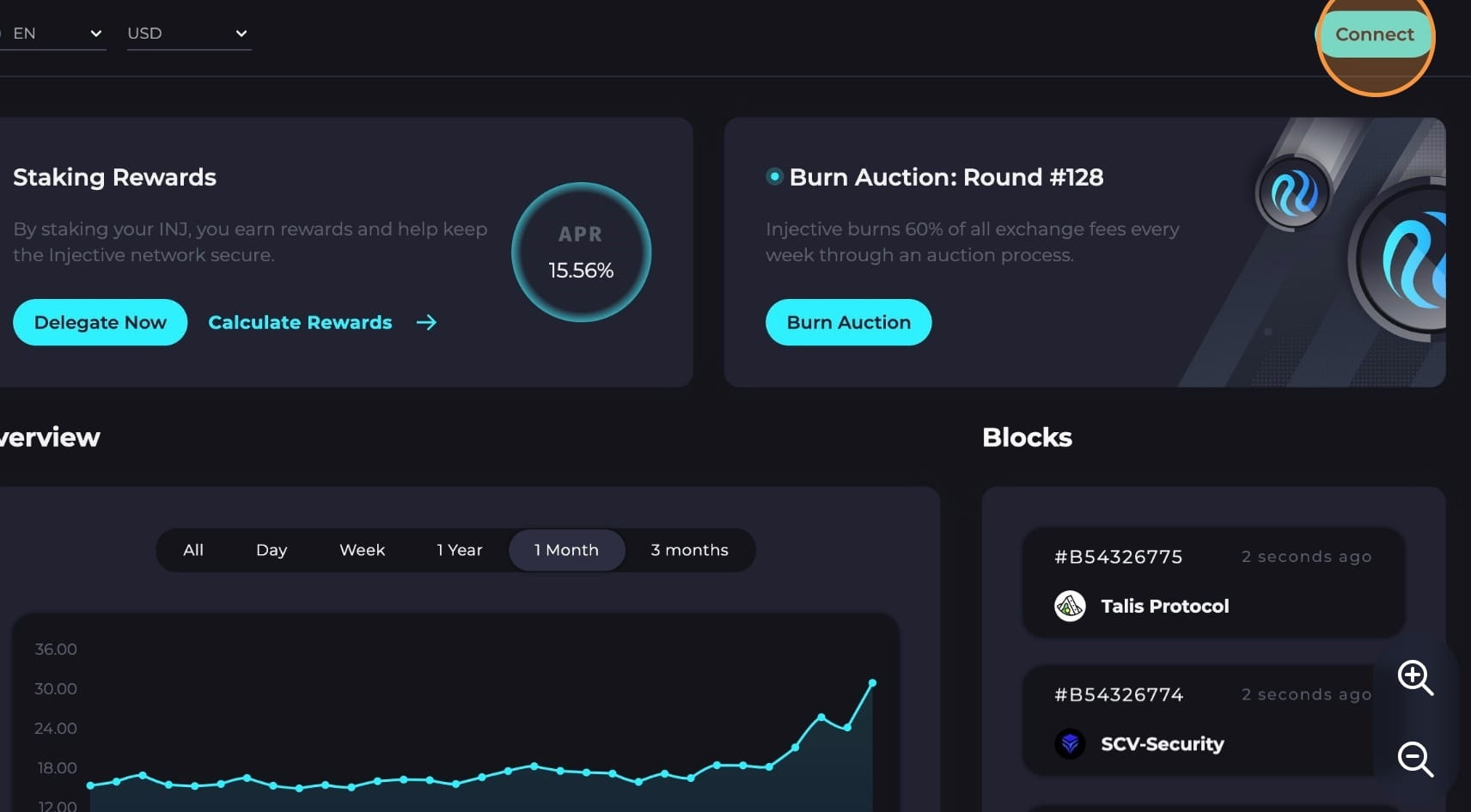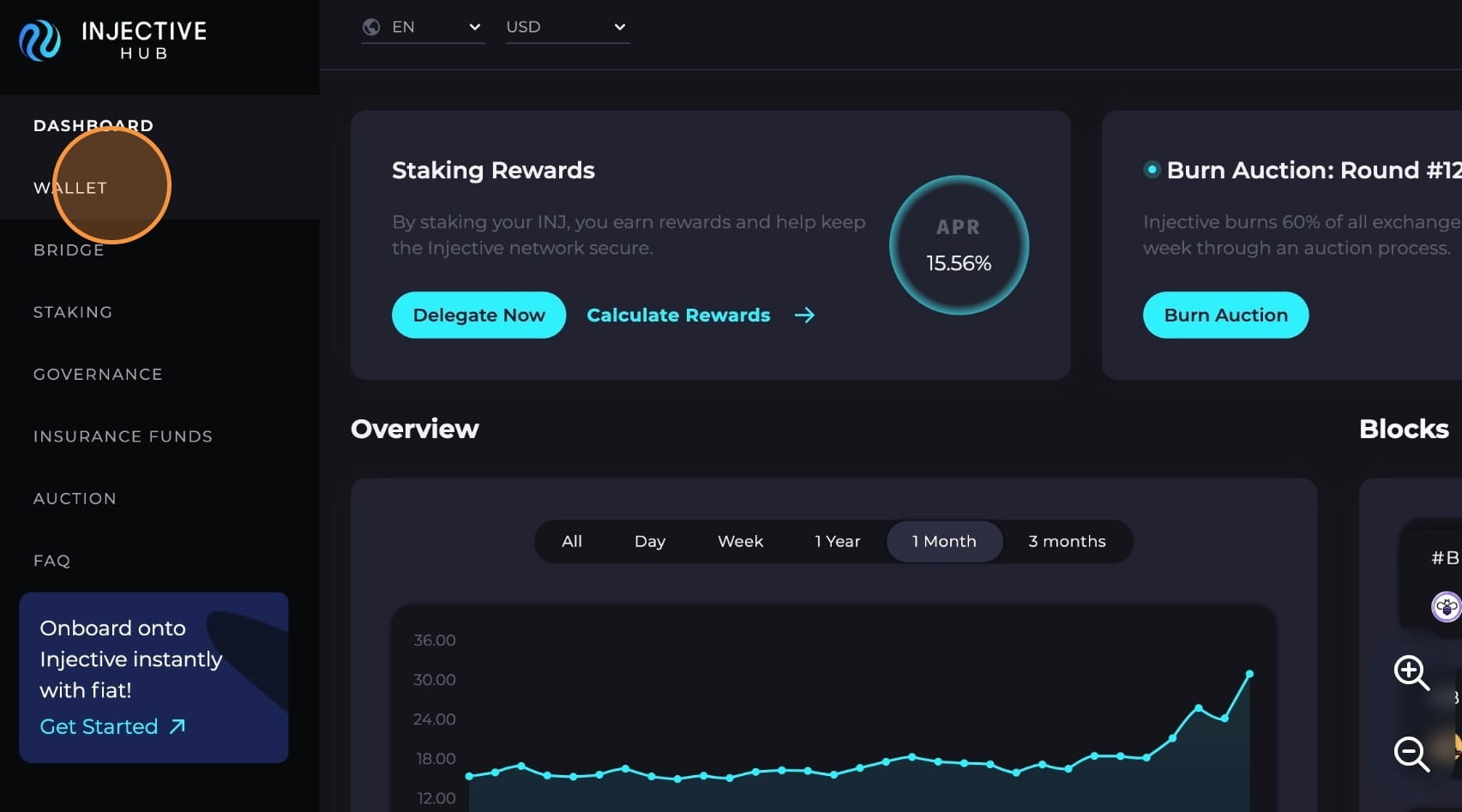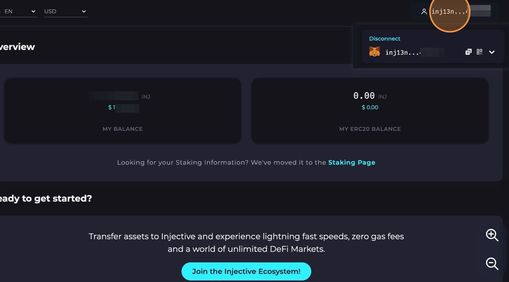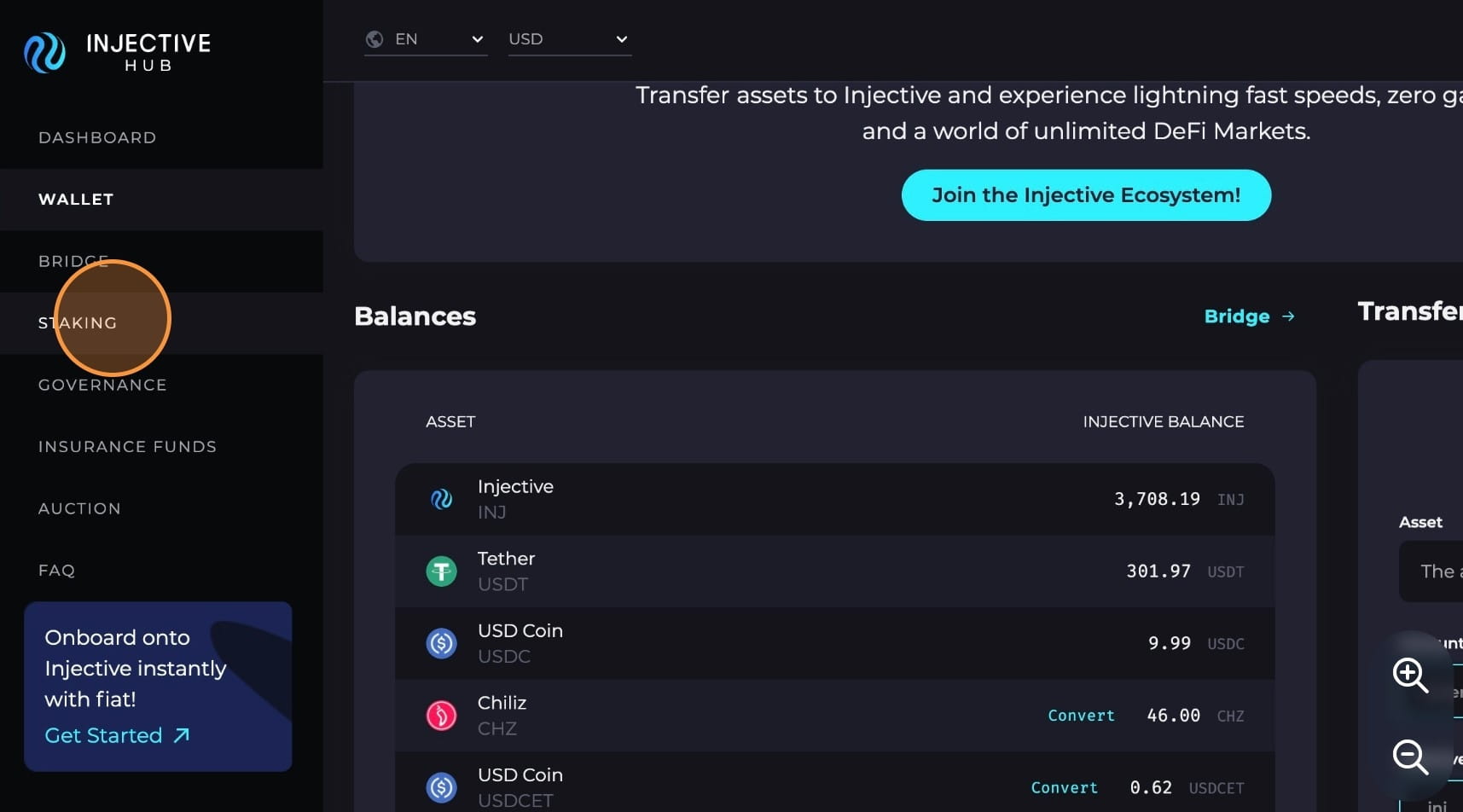 Přejděte zpět do Injective Hub a kliknutím na „Peněženka“ zobrazte svá převedená aktiva