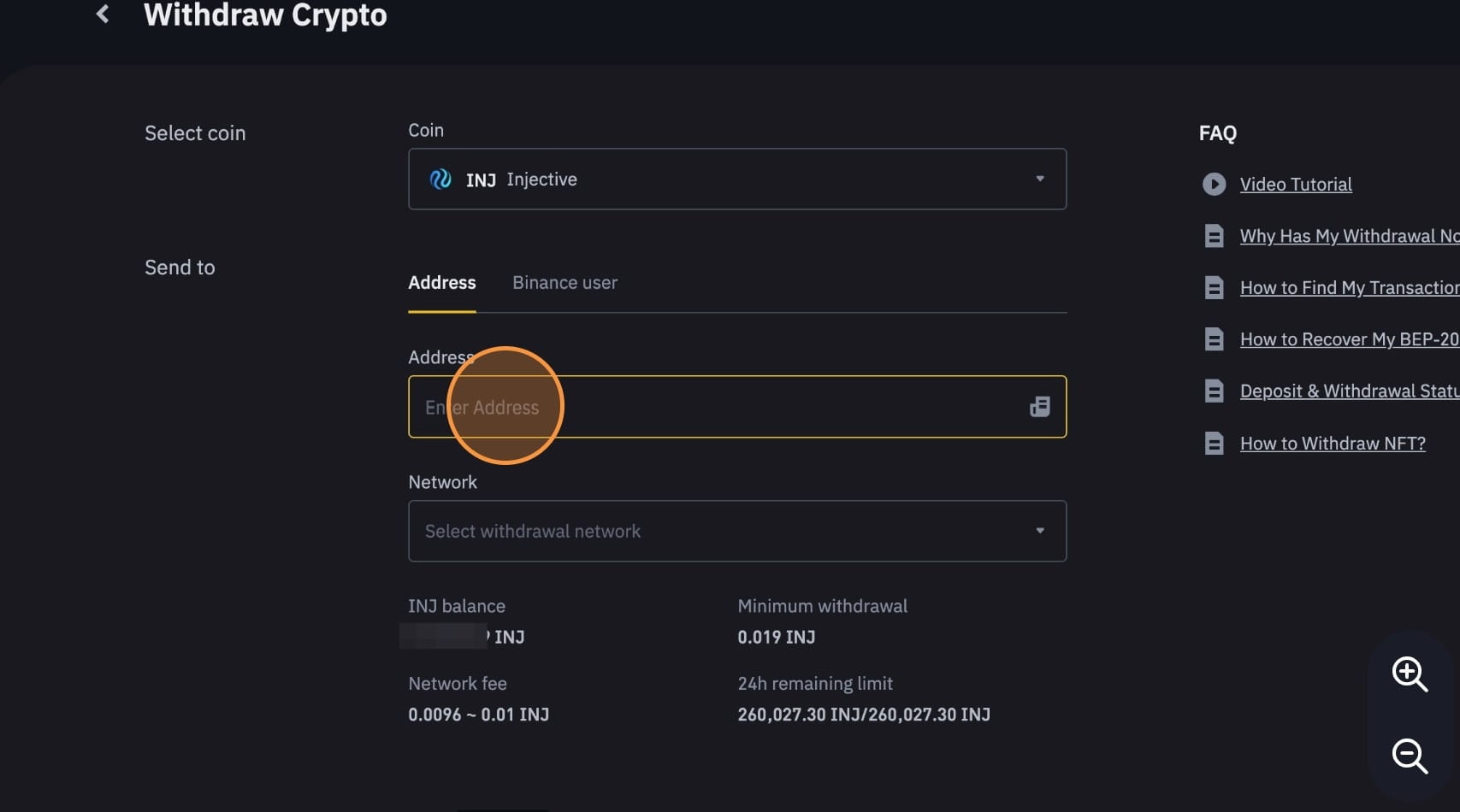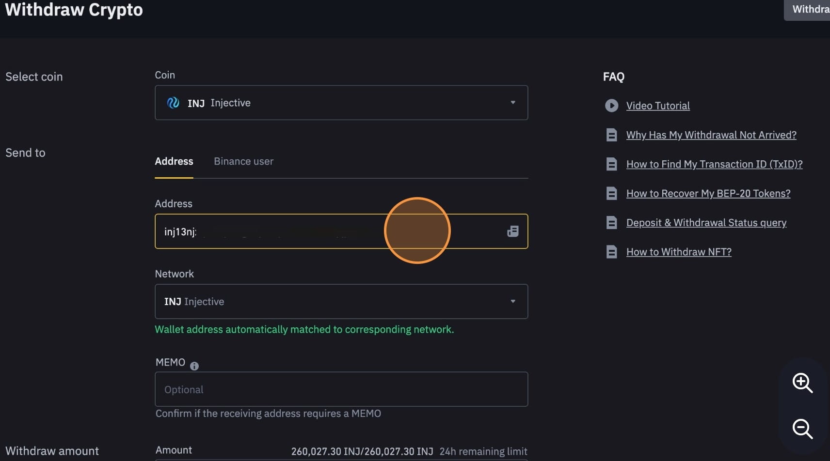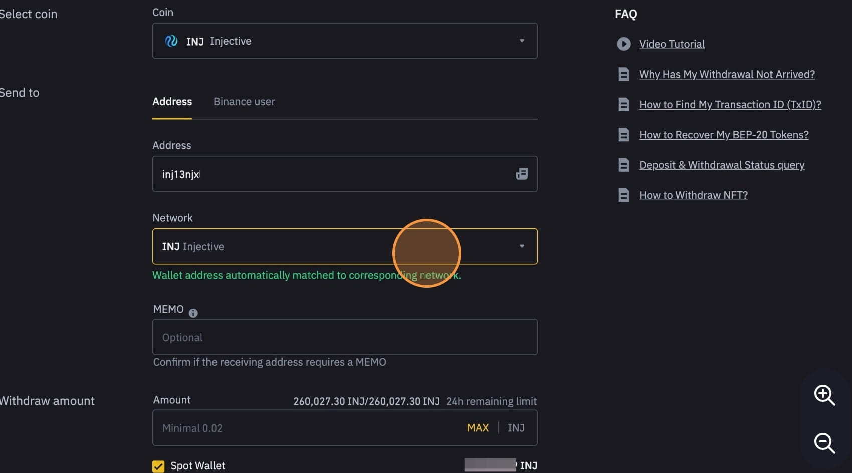 Zadejte částku INJ, kterou chcete vybrat